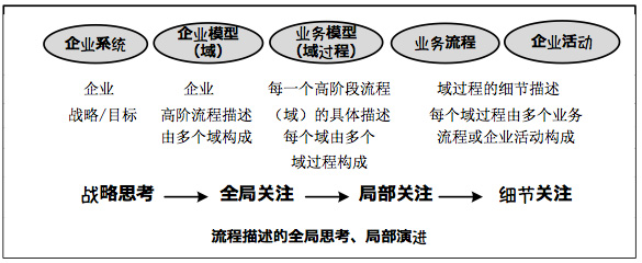 原则1:描述流程时,不要过早地限于细节之中,应该有全局思考的观念,将企业流程和行为划分为多个层次: